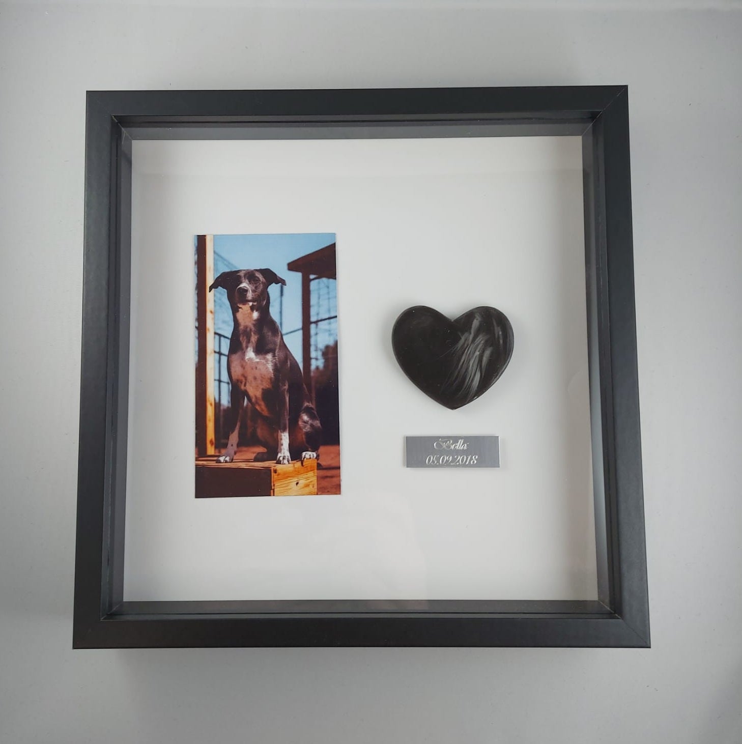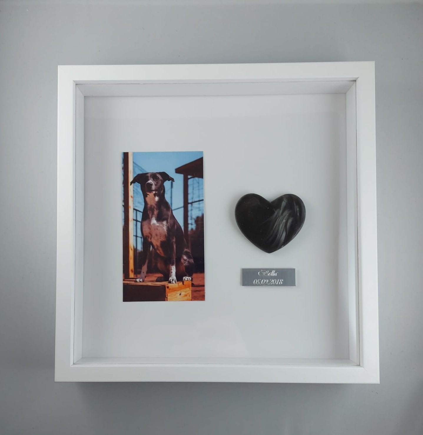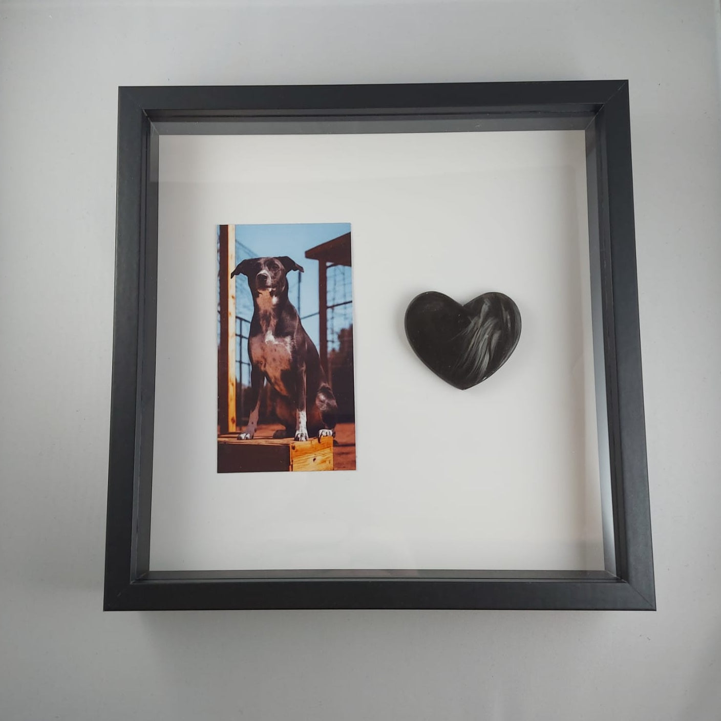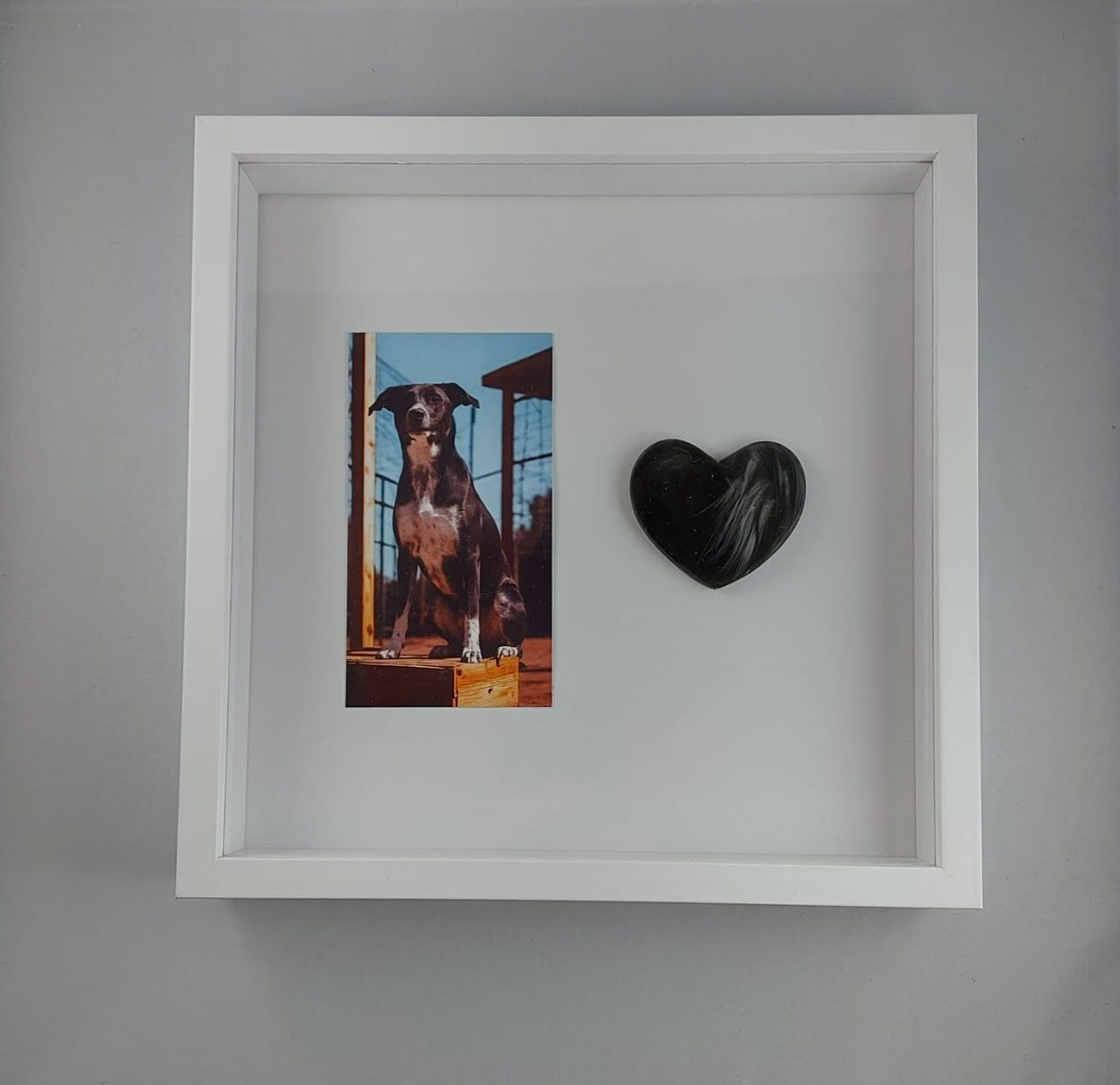 Kaunis muistotaulu ; figuuri tehty käyttäen lemmikkisi karvoja. Taulun voi asettaa tasolle tukijalalla (löytyy takaa) tai ripustaa seinälle (takana kiinnitysmekanismi ruuville/naulalle). Taulun kehykset ovat mdf-levyä ja "lasi" kirkasta pleksiä.