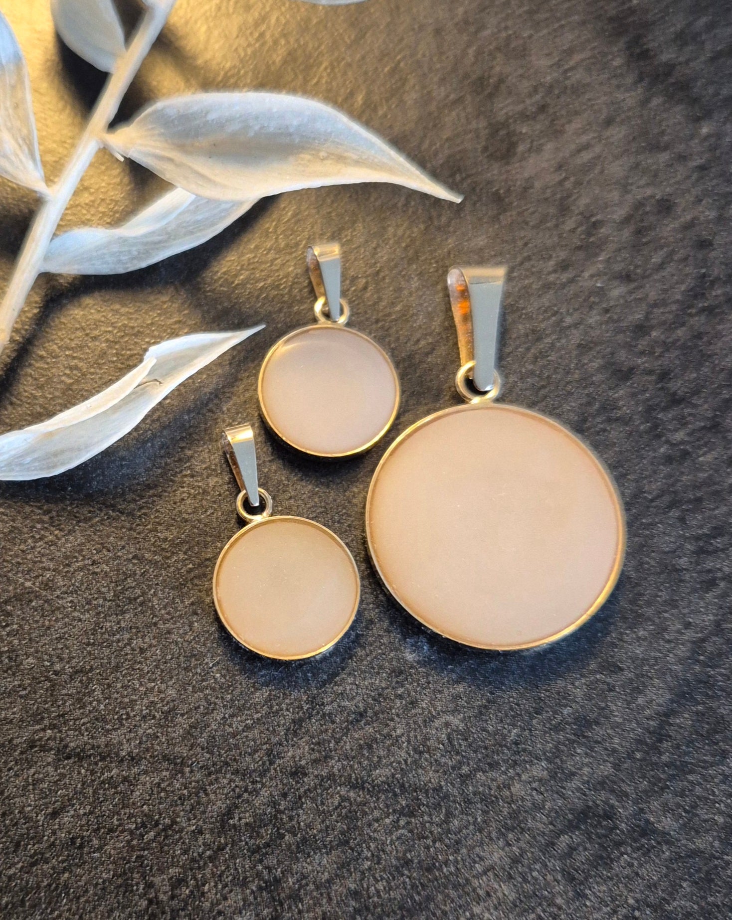 Äidinmaitokivi on kiinnitetty 925-sterlinghopeiseen tai 14k kultaiseen pohjaan, jonka taakse on mahdollista ostaa käsinkaiverrus.